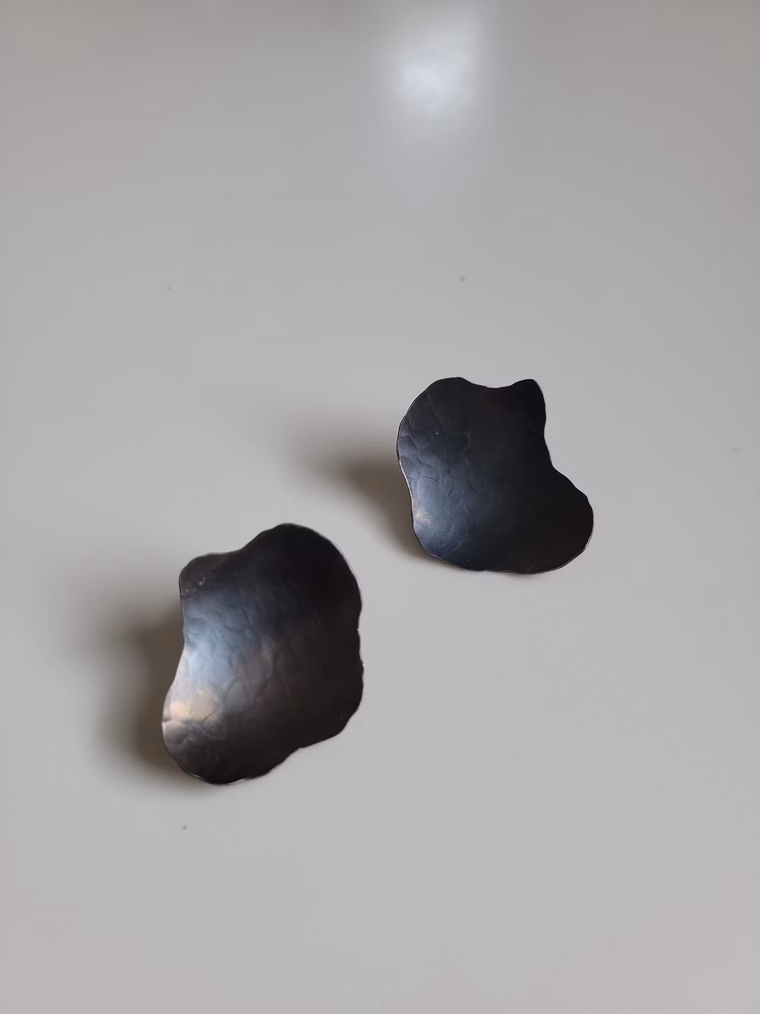 Øresmykke i oksidert sølv. Sitter på øret med stift og skjuler litt av øreflippen.